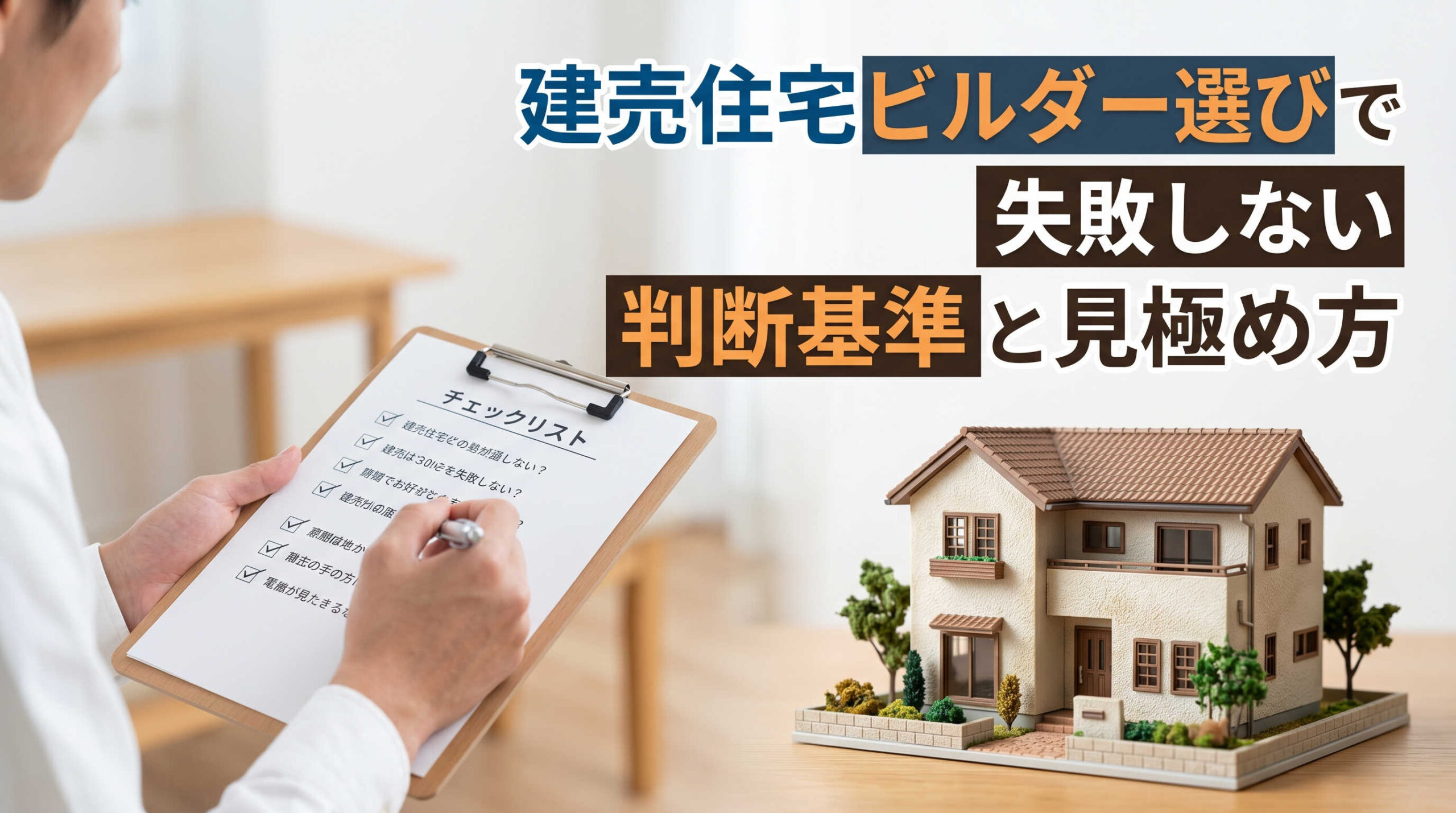 建売住宅ビルダー選びで失敗しない判断基準は、①施工品質、②保証内容、③会社の安定性、④口コミ・評判、⑤価格の透明性という5つの軸で整理できます。見た目や価格だけで判断せず、複数社を比較しながら、見学・商談の場で具体的な確認を行うことが大切です。