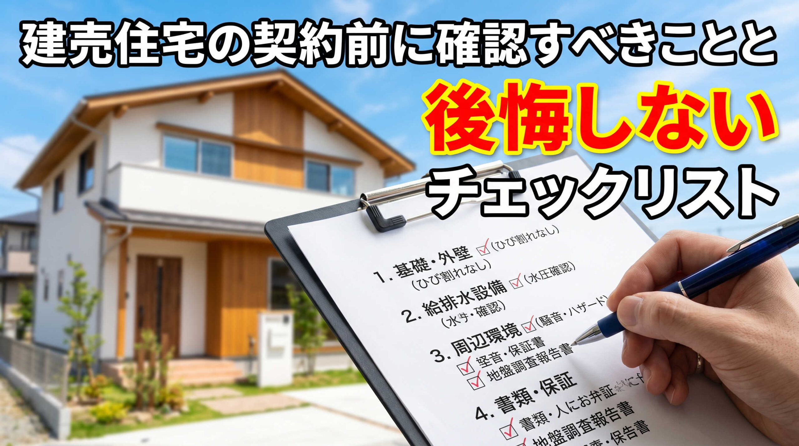 建売住宅の契約前に必ず確認すべき10のことを、チェックリスト形式でご紹介しました。売主の信頼性・土地の安全性・建物の耐震性・欠陥の有無・周辺環境・保証内容・総費用・ローン審査・ローン特約・急かし行為の有無——この10項目を一つひとつ確認することで、後悔のない住宅購入に近づけます。